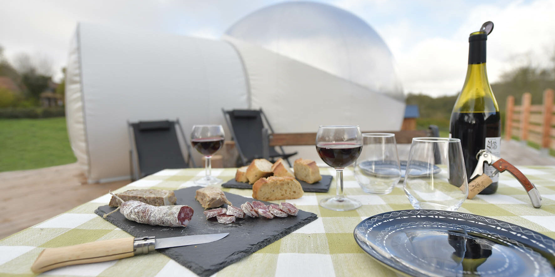 Nous vous proposons toute une offre de boissons, planches apéritives et paniers repas, que nous apportons directement dans votre logement insolite !